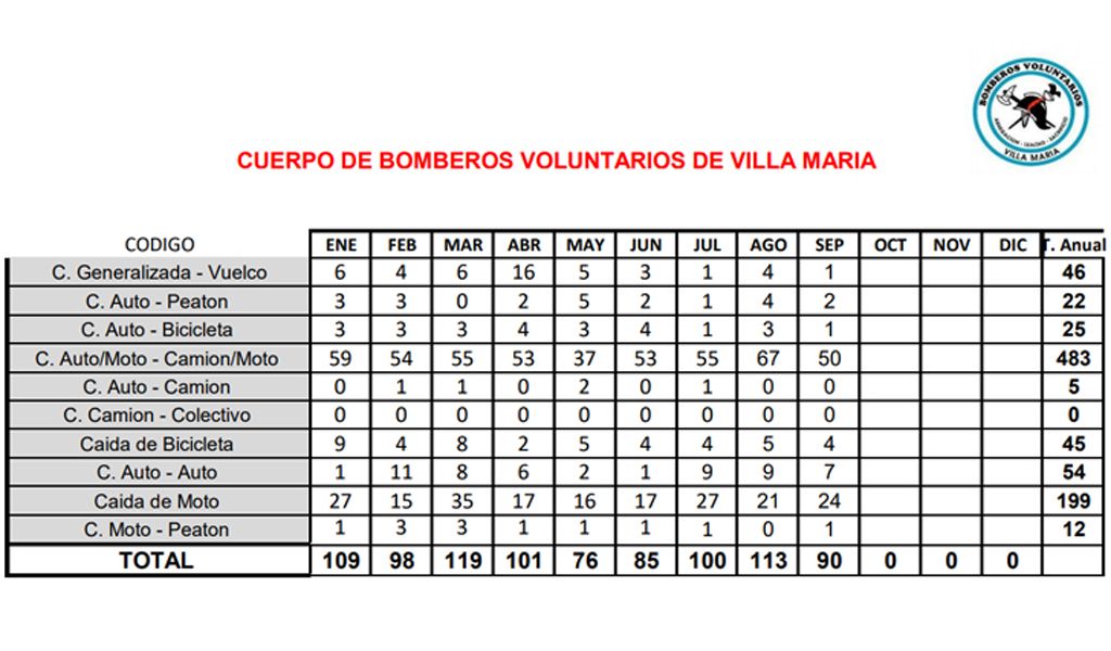 En los primeros nueve meses del año se registraron 891 accidentes de tránsito y la mayoría fueron protagonizados por motocicletas. La cifra fue proporcionada a los medios de comunicación por el Cuerpo de Bomberos Voluntarios de Villa María. En septiembre, el último de los meses de los que se tiene analizado, se produjeron 90 siniestros, apenas 13 menos de los sucedidos en agosto.