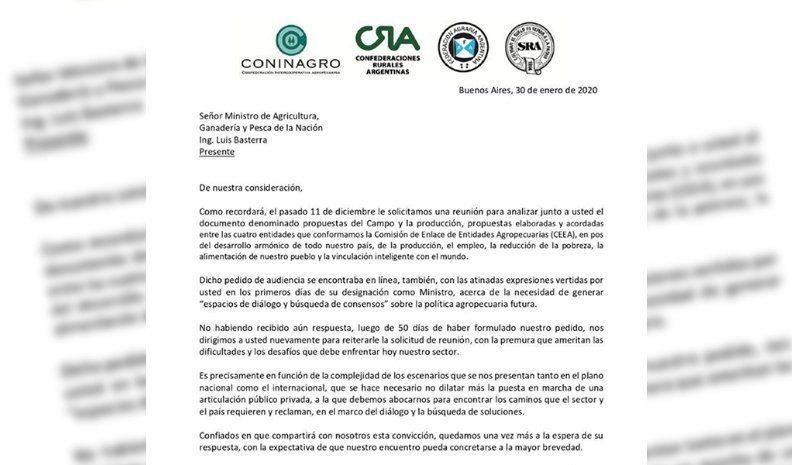 “Como recordará, el pasado 11 de diciembre le solicitamos una reunión para analizar junto a usted el documento denominado ‘Propuestas del campo y la producción’, propuestas elaboradas y acordadas entre las cuatro entidades que conformamos la Comisión de Enlace de Entidades Agropecuarias, en pos del desarrollo armónico de nuestro país, la producción, el empleo, la reducción de la pobreza, la alimentación de nuestro pueblo y la vinculación inteligente con el mundo”, comienza relatando la nota presentada al ministro nacional y que lleva la firma de Carlos Achetoni, de Federación Agraria; Carlos Inanizzotto, de Coninagro; Jorge Chemes, de CRA y Daniel Pelegrina, de SRA.