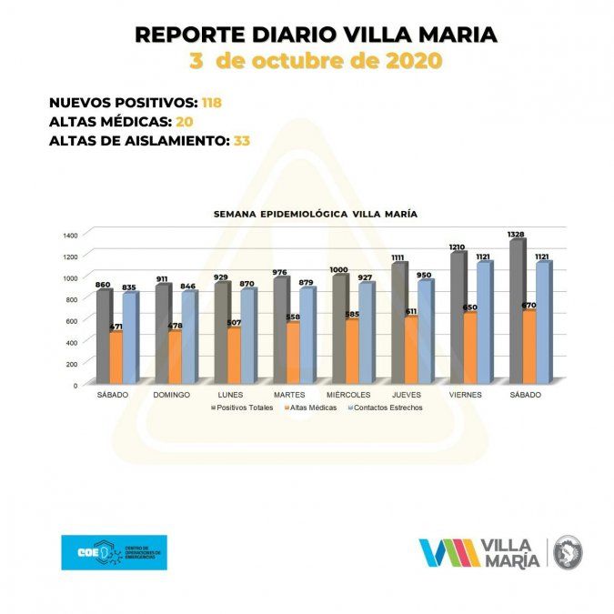Villa María reportó 118 nuevos casos de coronavirus. Además, el El COE y el Municipio de Villa María informó 20 altas médicas definitivas y 33 altas de aislamiento.