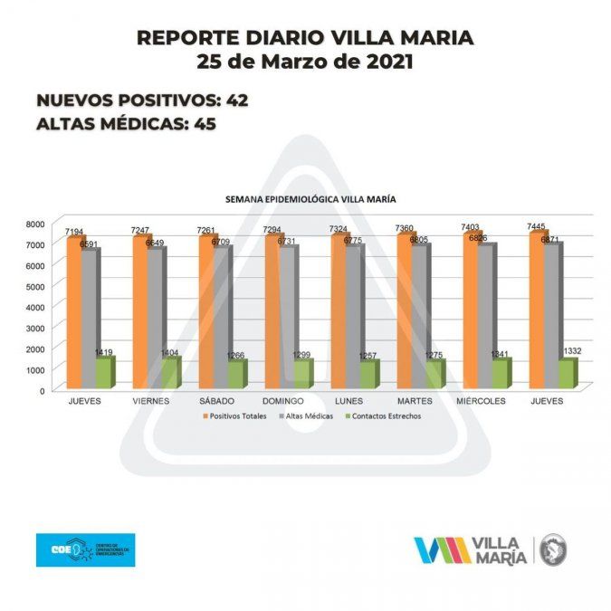 Las autoridades sanitarias de Villa María reportaron 42 nuevos contagios por Covid-19. En el informe epidemiológico correspondiente a este jueves, se informaron también 45 altas médicas definitivas durante las últimas 24 horas.