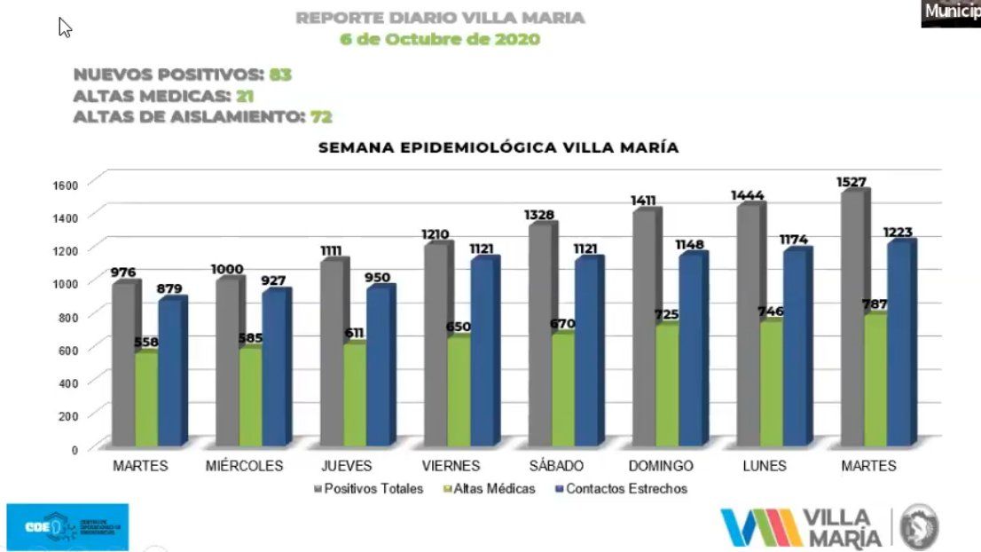 El informe brindado por el COE y el Municipio de Villa María, confirmó este martes 83 nuevos contagios de Covid-19. Además, las autoridades informaron 41 altas médicas definitivas y 72 altas de aislamiento.