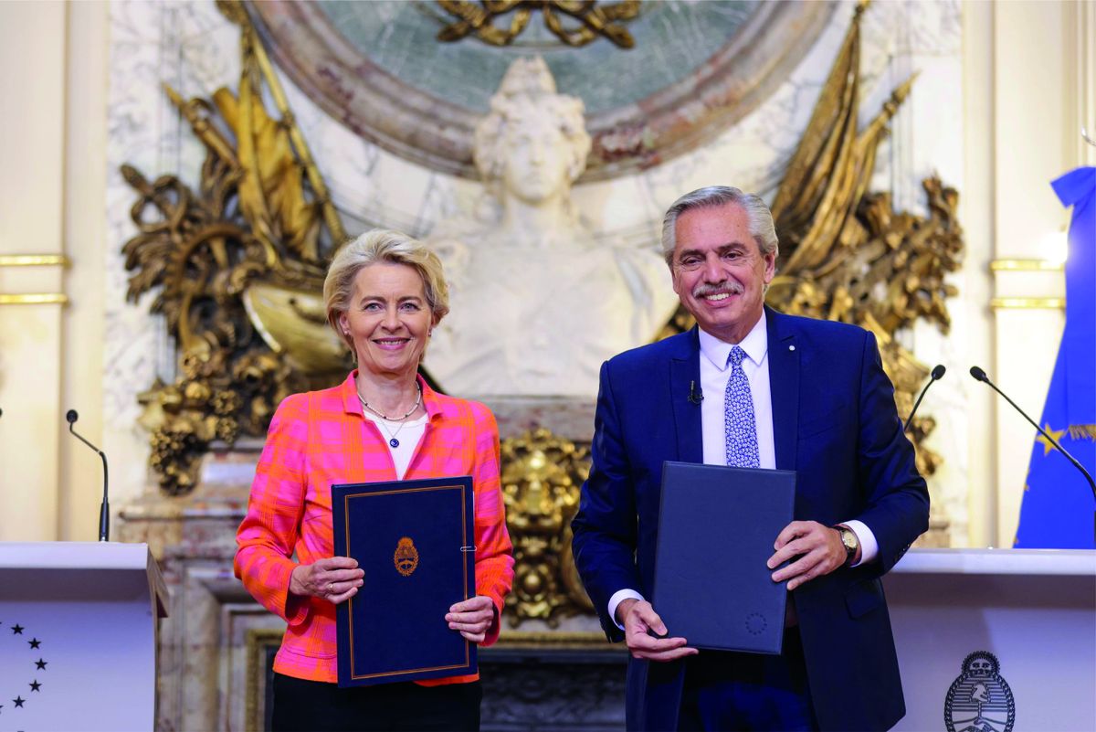 Alberto Fernández recibió hoy a la titular de la Comisión Europea (CE), Úrsula von der Leyen, con quien brindó una declaración conjunta en el que refirieron a un acuerdo comercial entre la Unión Europea (EU) y el Mercosur, en la que el presidente argentino advirtió que "aparecieron nuevos problemas que tienen que ver con el proteccionismo" para su concreción.
