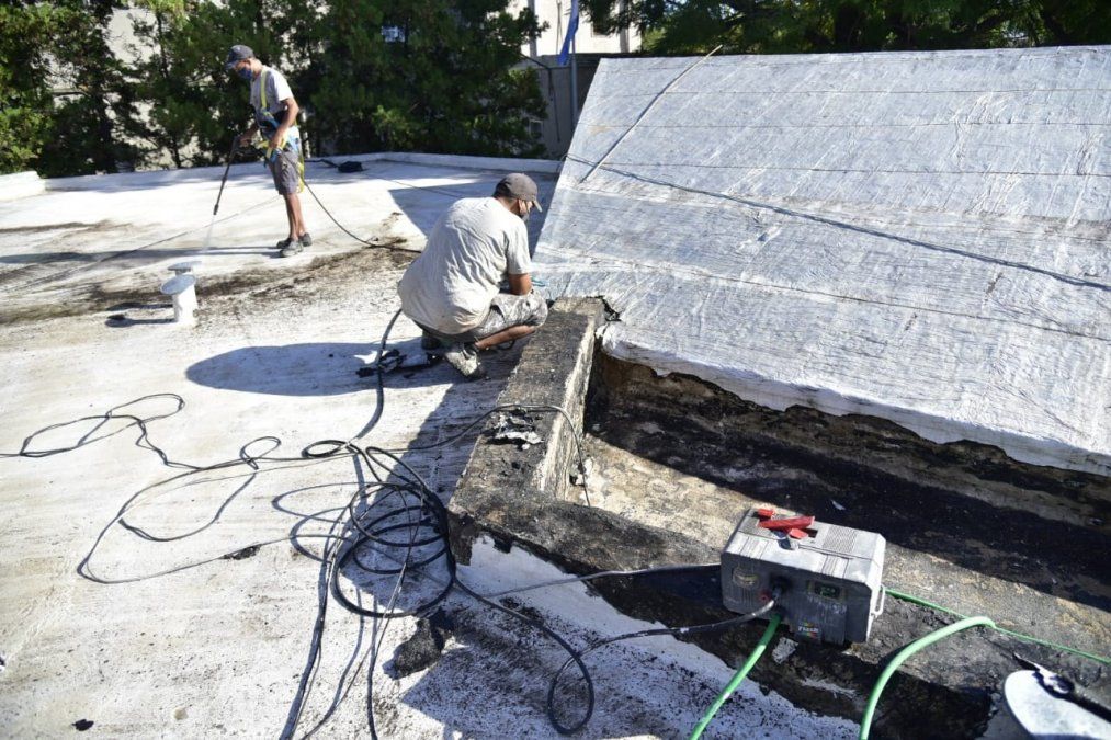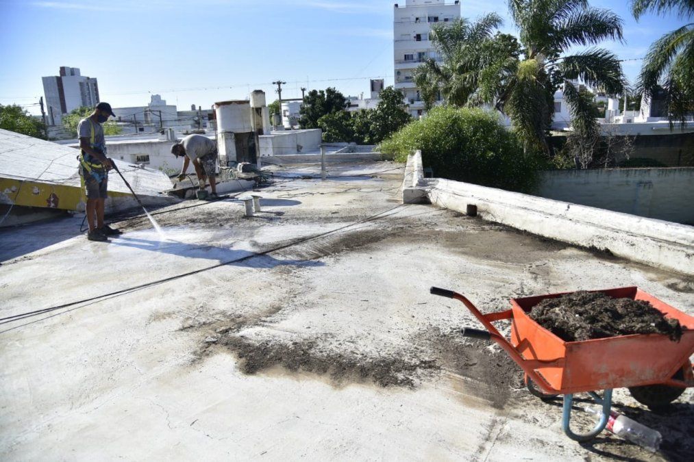 En tanto en la Escuela Rivadavia, de barrio San Justo, se trabaja en la reparación e impermeabilización de los techos.
