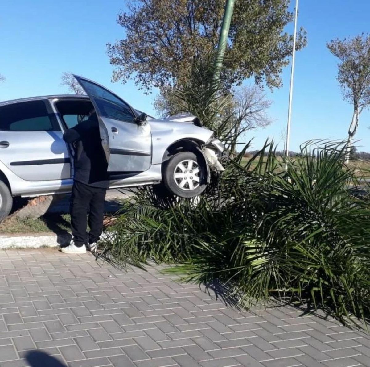 También en Oliva, pero en las calles de la ciudad, se produjo en horas de la mañana otro accidente de tránsito que involucró un solo vehículo, que impactó contra una palmera y un poste de luz.