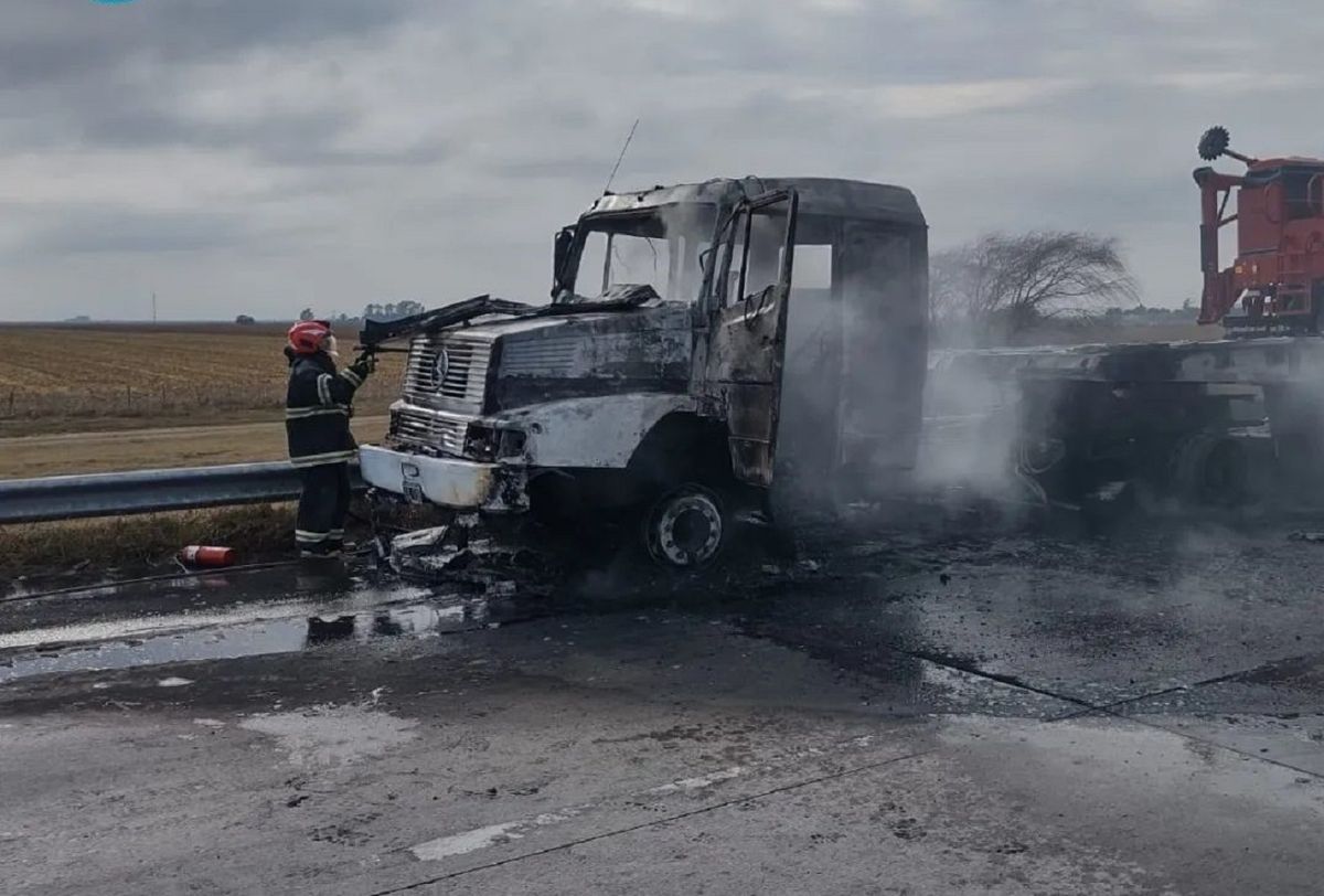 El fuego se apoderó raudamente de un camión, vehículo que remolcaba un carretón con maquinaria agrícola.