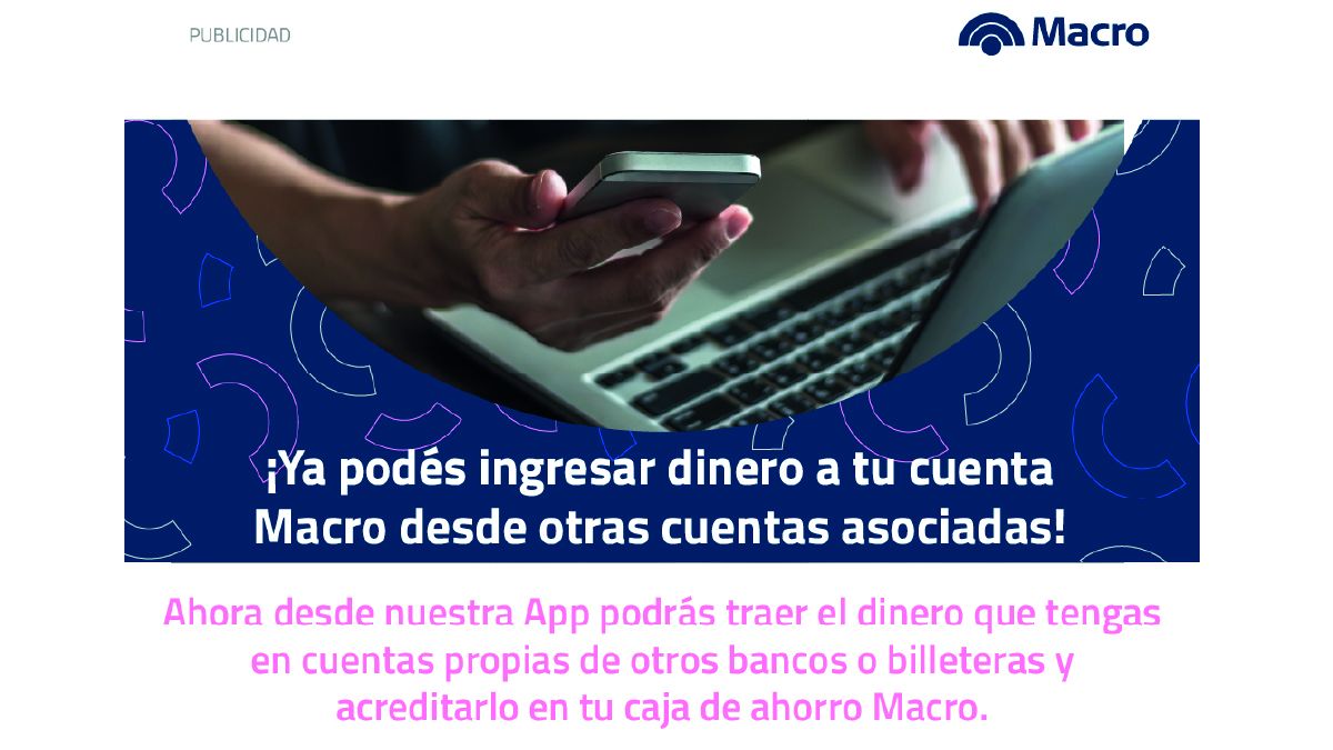 Así, quien tenga fondos en otros bancos o una fintech podrá ingresarlo a su cuenta de Banco Macro con un sólo “click” y manejar con practicidad sus finanzas personales.