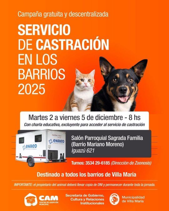 Vecinos de toda la ciudad podrán acceder al procedimiento, que requiere una charla informativa previa como condición para realizar la intervención. Los turnos se solicitan vía WhatsApp al 3534 29-6185, perteneciente a la Dirección de Zoonosis.
