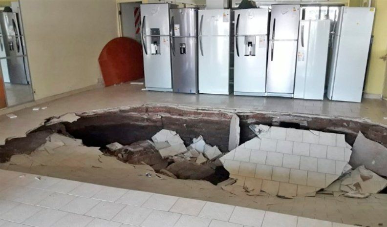 Una casa de electrodomésticos registró un desmoronamiento del piso de su salón de exhibición de productos sobre el interior de un viejo sótano que habría sufrido los embates de la acumulación prolongada de agua.