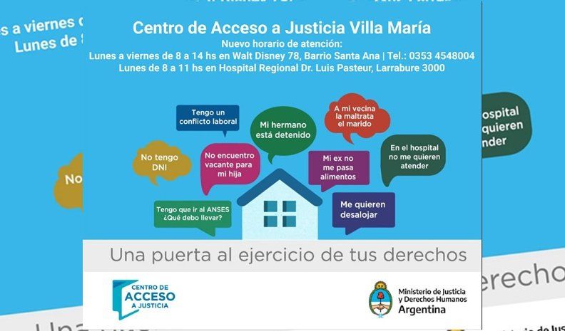 El Ministerio de Justicia y Derechos Humanos de la Nación anuncia que el Centro de Acceso a Justicia (CAJ) de Villa María, ubicado en Walt Disney 78, Barrio Santa Ana, brindará atención a partir de hoy, de lunes a viernes de 8 a 14.