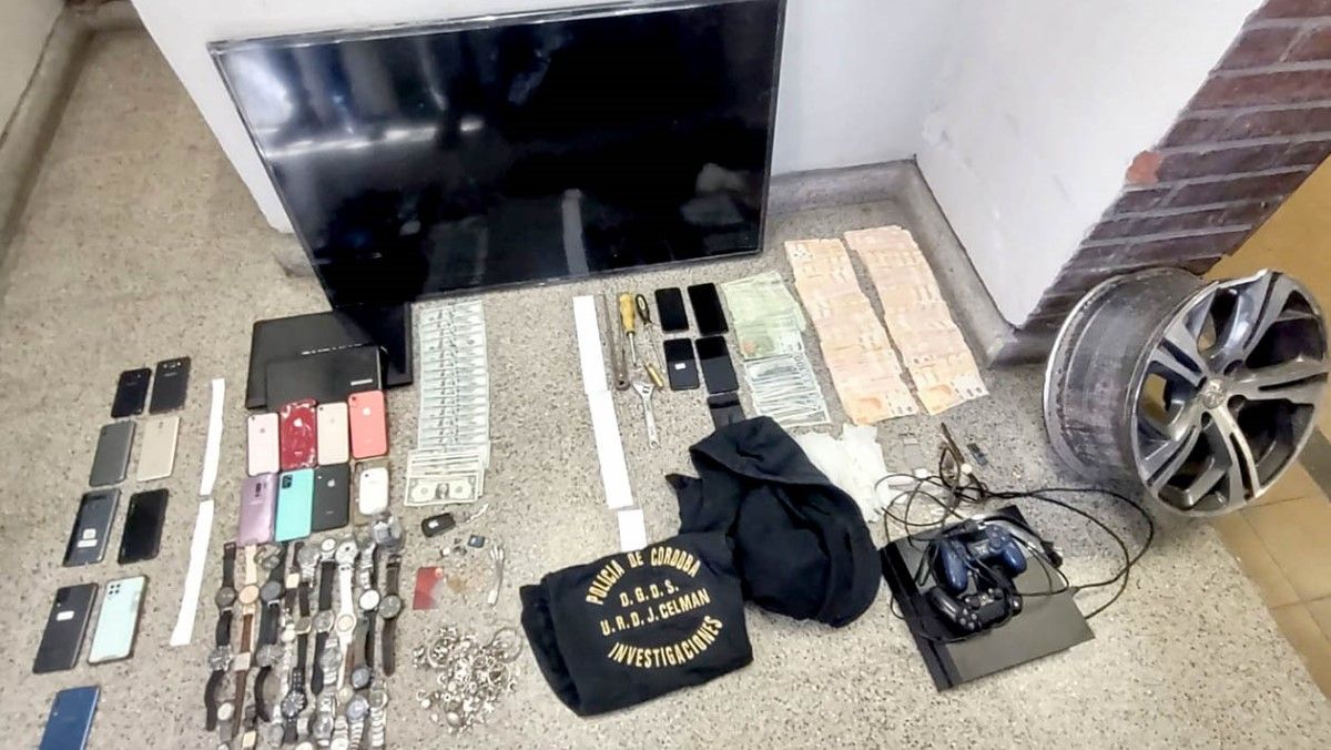 El personal policial irrumpió en las últimas horas en dos domicilios de los barrios Pueyrredón y dos vivienda de barrio Yapeyú de la ciudad de Córdoba, con el secuestro de 22 teléfonos celulares, algo más de medio millón de pesos, unos cinco mil dólares, joyas de oro y plata, treinta relojes de pulsera, un televisor de 50 pulgadas, dos computadoras personales, un automóvil Peugeot 208, un Fiat Palio y prendas de vestir.