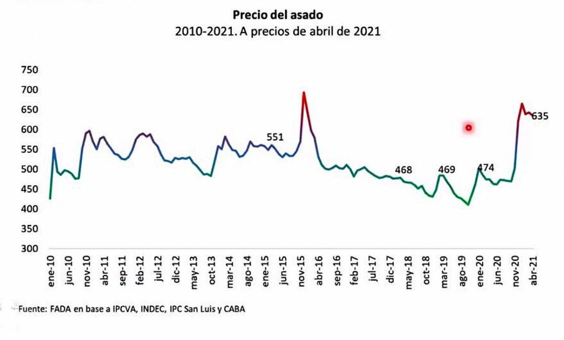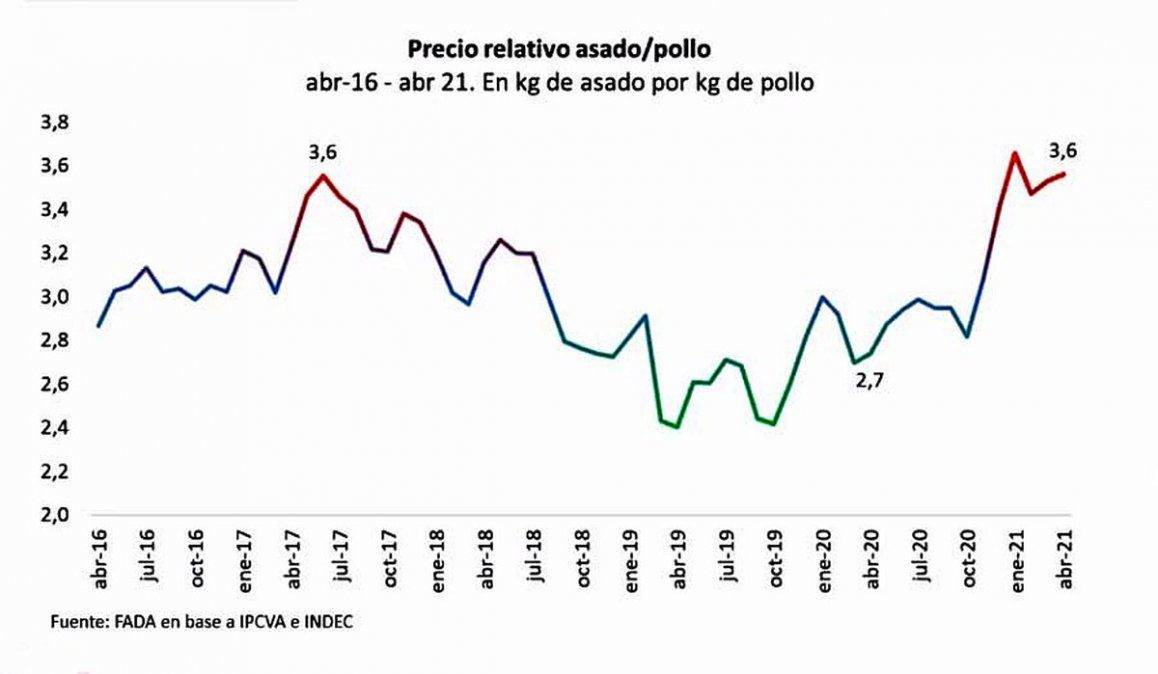 En términos comparativos, el kilo de asado no sólo subió en el último año más que el dólar, como fue una reseña reiterada en los últimos días, sino que tomando una ventana temporal de 5 años, también muestra un máximo de diferencia contra el precio de un competidor directo como es el pollo. En este caso,Miazzo explicó que actualmente con un kilo de asado se compran 3,6 kilos de pollo, el mismo valor que en el segundo trimestre de 2017. Antes de la pandemia se compraban entre 2,4 y 3 kilos.