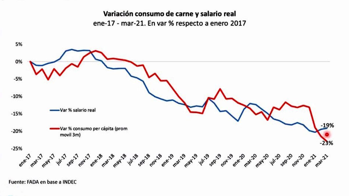 Por último, un dato no menor que mostró el economista de Fada estuvo orientado a la relación que existió entre la variación en el consumo de carne vacuna y la evolución de los salarios, en dos curvas con una similitud muy fuerte que partieron de enero de 2017 y finalizan ahora con un retroceso del 19% en los haberes reales y del 23% en el consumo de cortes vacunos.