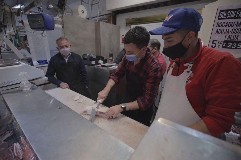 En apoyo al sector de la carne, los candidatos se pusieron detrás del mostrador de una carnicería del Mercado y afirmaron: “El cepo a las exportaciones de carne es un retroceso en el desarrollo y expansión de nuestro país”.