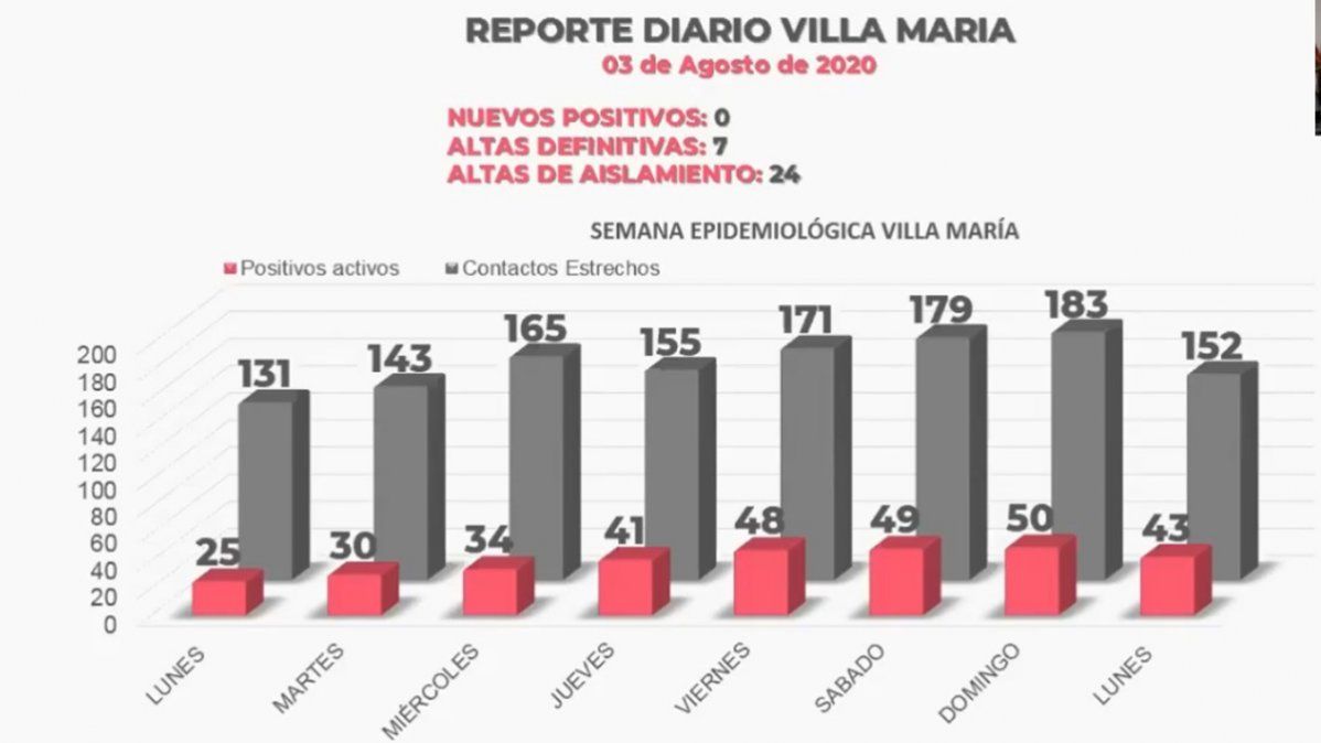 El total de contactos estrechos aislados disminuyó de 183 a 152. Bajo aislamiento se mantienen 195 personas y ninguno de los 43 casos activos se encuentra bajo internación.