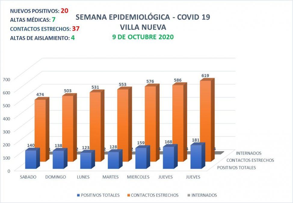 En las últimas 24 horas, la ciudad de Villa Nueva sumó 20 nuevos casos positivos de Covid, en tanto que se otorgaron 7 altas médicas. Del mismo modo, se aisló a 37 personas por ser contactos estrechos y se otorgaron 4 nuevas altas de aislamiento.