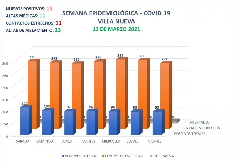 En las últimas 24 horas se registraron 11 casos positivos de Covid-19 en Villa Nueva, en tanto que se otorgaron 11 altas médicas y 23 altas de aislamiento. Además, se informó que aislaron a 11 personas por ser contactos estrechos.