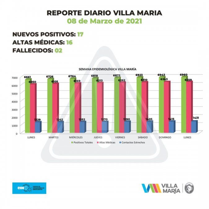 Villa María acumula 6.960 contagios, 6.359 altas médicas y 1.431 contactos estrechos. Por último, se informó que las personas aisladas son 1.908 y que los casos activos suman 477.