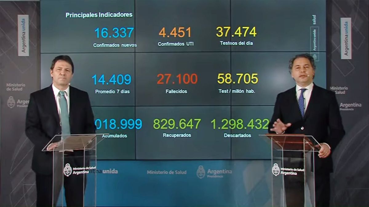 El Ministerio de Salud informó esta mañana un promedio diario de 14.409 casos de coronavirus en los últimos siete días, con una tasa de mortalidad de 597 personas cada millón de habitantes y de letalidad del 2,7% sobre los casos confirmados.