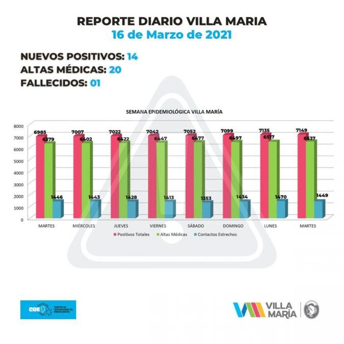 Las autoridades del municipio de Villa María confirmaron para este martes, 14 nuevos positivos a Covid-19 y 20 altas médicas definitivas. Lamentablemente, falleció una mujer de 82 años.