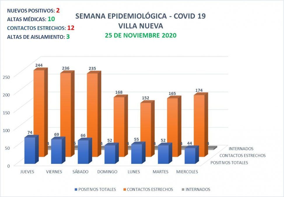 En las últimas 24 horas, Villa Nueva registró 2 nuevos casos positivos de Covid-19, en tanto que se otorgaron 10 altas médicas y 3 nuevas altas de aislamiento. Del mismo modo, se aisló a 12 personas por ser contactos estrechos.