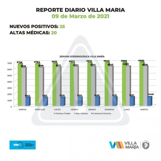 Desde el comienzo de la pandemia, el total acumulado de casos fue de 6.985, mientras que las altas médicas otorgadas en ese periodo fueron 6.379.