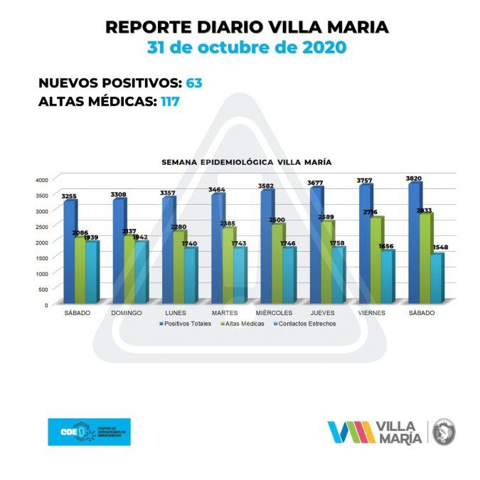 El total acumulado de contagios en Villa María, asciende a 3.820, mientras que las altas médicas llegan a 2.833. Las personas declaradas como contactos estrechos en la ciudad son 1.548.