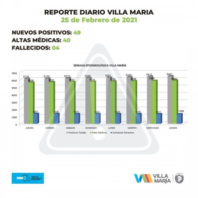 Se actualizó también la información del Registro Civil, informando 4 decesos por coronavirus que corresponden a las jornadas del 22 y 23 de febrero. Los fallecidos son una mujer de 93 años y tres hombres de 57, 74 y 75 años.