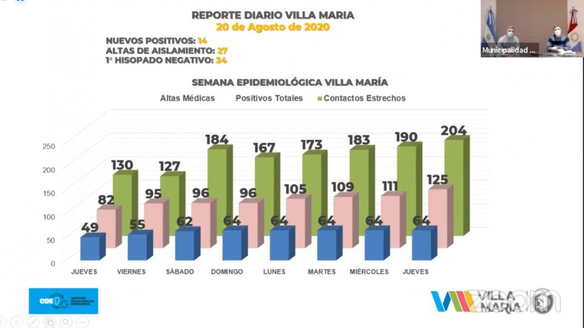 Los contactos estrechos aislados ascendieron a 204, mientras que 27 personas recibieron el alta de aislamiento. El total acumulado de altas definitivas de pacientes covid-19 se mantiene en 64.