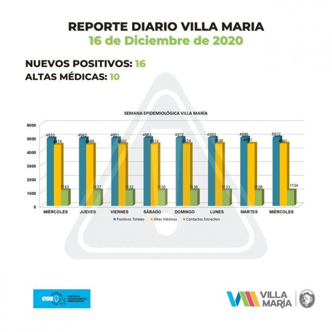 El reporte sanitario correspondiente a Villa María, reportó 16 nuevos positivos a Covid-19. Del mismo modo, informaron 10 nuevas altas médicas.