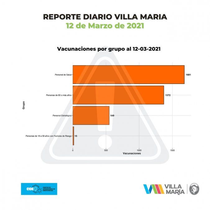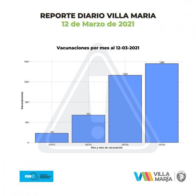En cuanto a la vacunación contra el covid-19, en Villa María ya son 3.617 las dosis aplicadas. Del total, 2.350 inmunizaciones fueron realizadas por la Secretaria de Salud del municipio, representando un 65%. El resto de las dosis fueron aplicadas por el Hospital Pasteur.