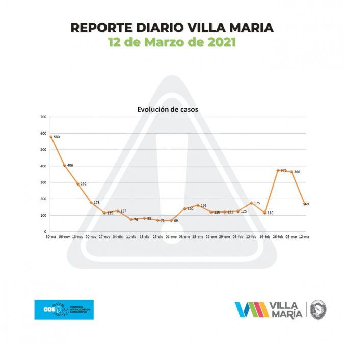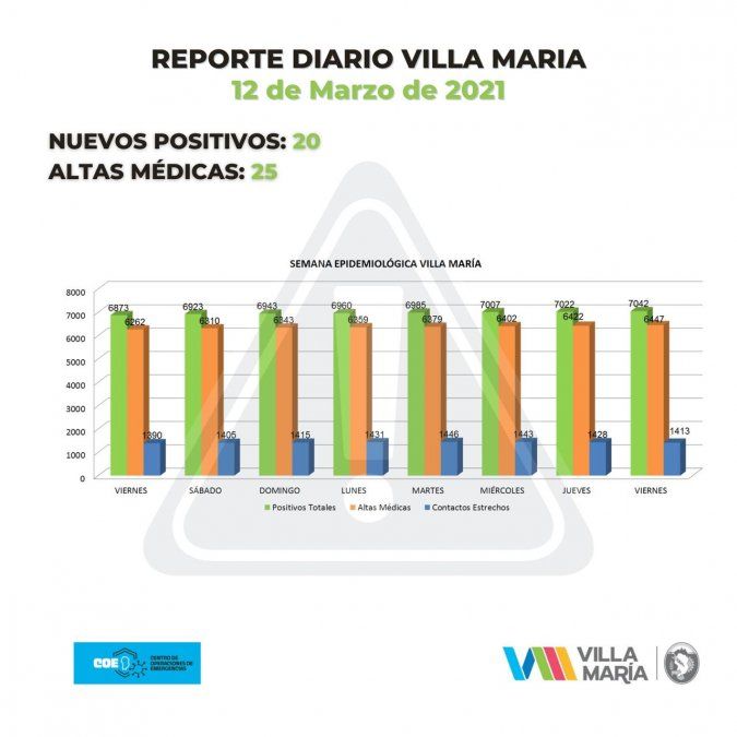 Las autoridades del COE y el municipio de Villa María emitieron el informe epidemiológico correspondiente a este viernes. Informaron 20 nuevos casos de Covid-19 y 25 nuevas altas médicas definitivas.
