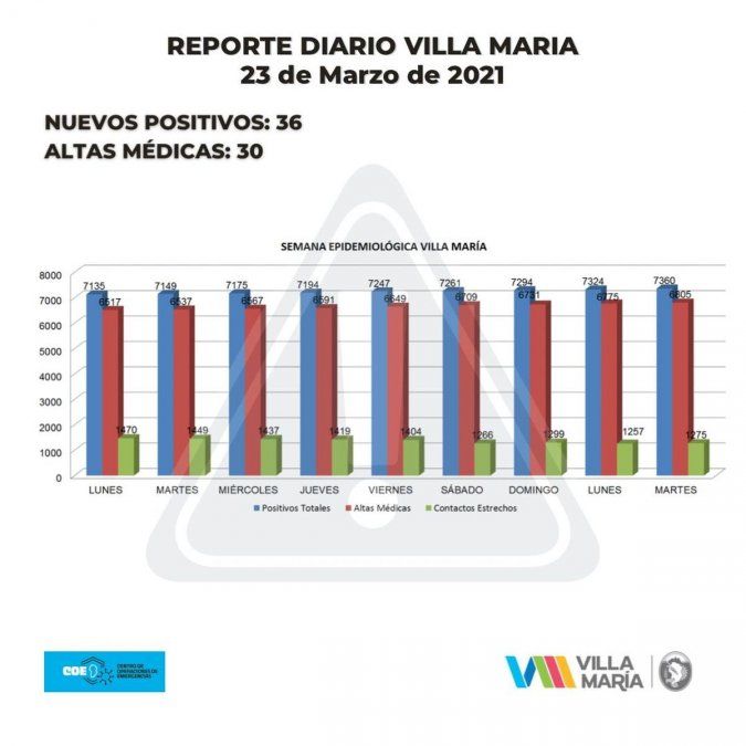 Las autoridades sanitarias del municipio de Villa María registraron este martes, 36 nuevos casos de Covid-19 en la ciudad. Las altas médicas brindadas en las últimas 24 horas, fueron 30.