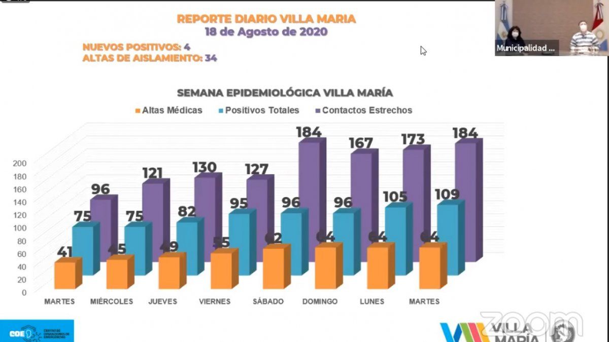 Las altas de aislamiento fueron 34 . El total de pacientes con alta definitiva se mantiene en 64. Por otra parte, los contactos estrechos aislados alcanza los 184 casos.