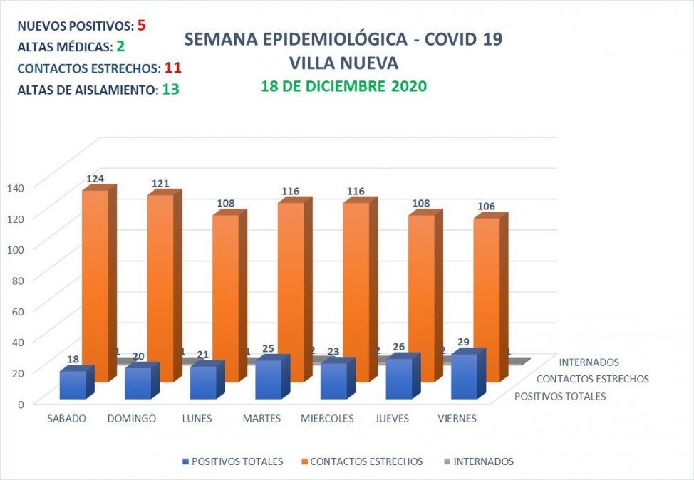 En total, actualmente, la ciudad contabiliza 29 casos activos de coronavirus, de las cuales, una persona se encuentra en internación. Desde el inicio de la pandemia, en Villa Nueva se contabilizan 1208 casos de Covid-19.