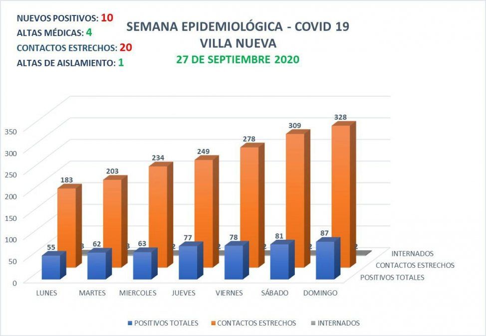 En el último día, la ciudad de Villa Nueva sumó 10 nuevos casos positivos de Covid, en tanto que se otorgaron 4 altas médicas. También, se otorgó un alta de aislamiento, mientras que se aisló a 20 personas, por ser contactos estrechos.
