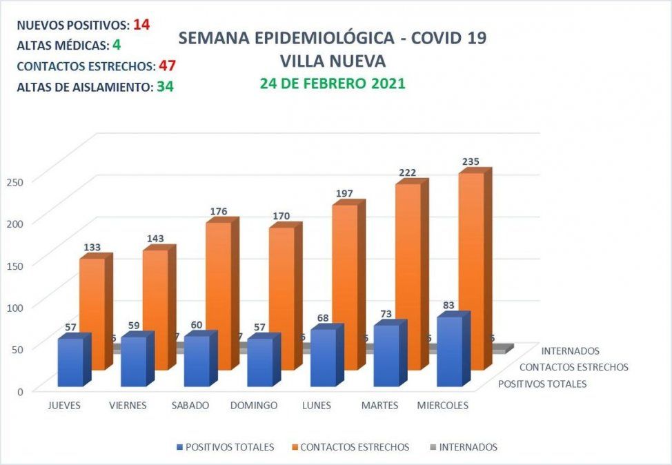 Desde el inicio de la pandemia, en Villa Nueva se contabilizan 1591 casos de Covid 19. La cantidad de contactos estrechos actualmente es de 235 personas.