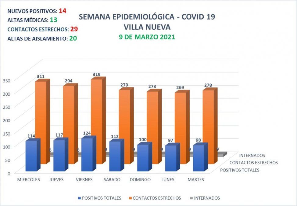 En las últimas 24 horas se registraron 14 casos positivos de coronavirus en Villa Nueva, mientras se otorgaron 13 altas médicas y 20 altas de aislamiento. En la jornada se aisló 29 personas por ser contactos estrechos.