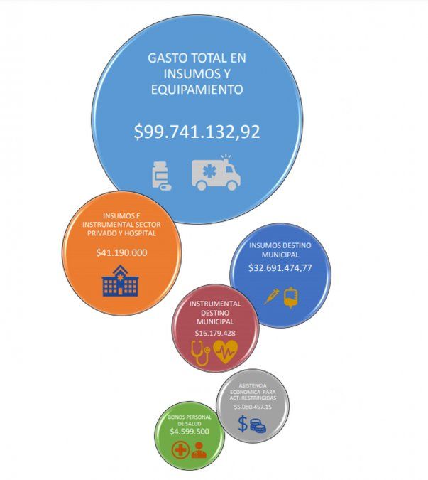 El monto total, que equivale apenas al 2,5 por ciento del presupuesto que destinó el Municipio para este 2021 (3.920 millones de pesos), abarca gastos que se realizaron para la puesta en marcha y funcionamiento del COE y la compra de instrumentos e insumos para el Municipio en áreas de atención al público.