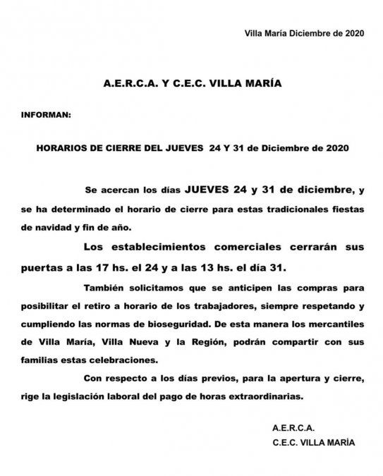 Finalmente, el comunicado de las organizaciones que nuclean al ámbito comercial de Villa María, Villa Nueva y región; solicita que se "anticipen las compras" con el objetivo de "posibilitar el retiro a horario de los trabajadores" y que pueden "compartir con sus familias estas celebraciones".