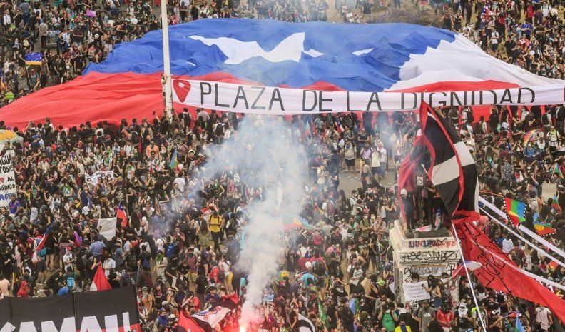 Decenas de miles de manifestantes participaron ayer de la denominada tercera marcha más grande de Chile, en la céntrica Plaza Italia de Santiago, donde a pocos metros y en medio de saqueos y enfrentamientos con las fuerzas del orden se registró un gran incendio en la sede de una universidad.