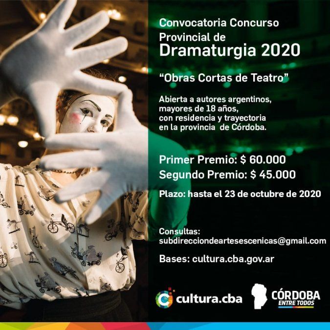 La Agencia Córdoba Cultura, a través de la Subdirección de Artes, convoca al Concurso Provincial de Dramaturgia – 2020-Obras Cortas de Teatro. El llamado está abierto del 25 de agosto y se extiende hasta el 23 de octubre de 2020. Pueden participar todos los autores argentinos, mayores de 18 años, con residencia y trayectoria en la provincia de Córdoba. Queda excluida de la presente convocatoria toda persona que sea dependiente de la administración pública municipal, provincial y/o nacional.