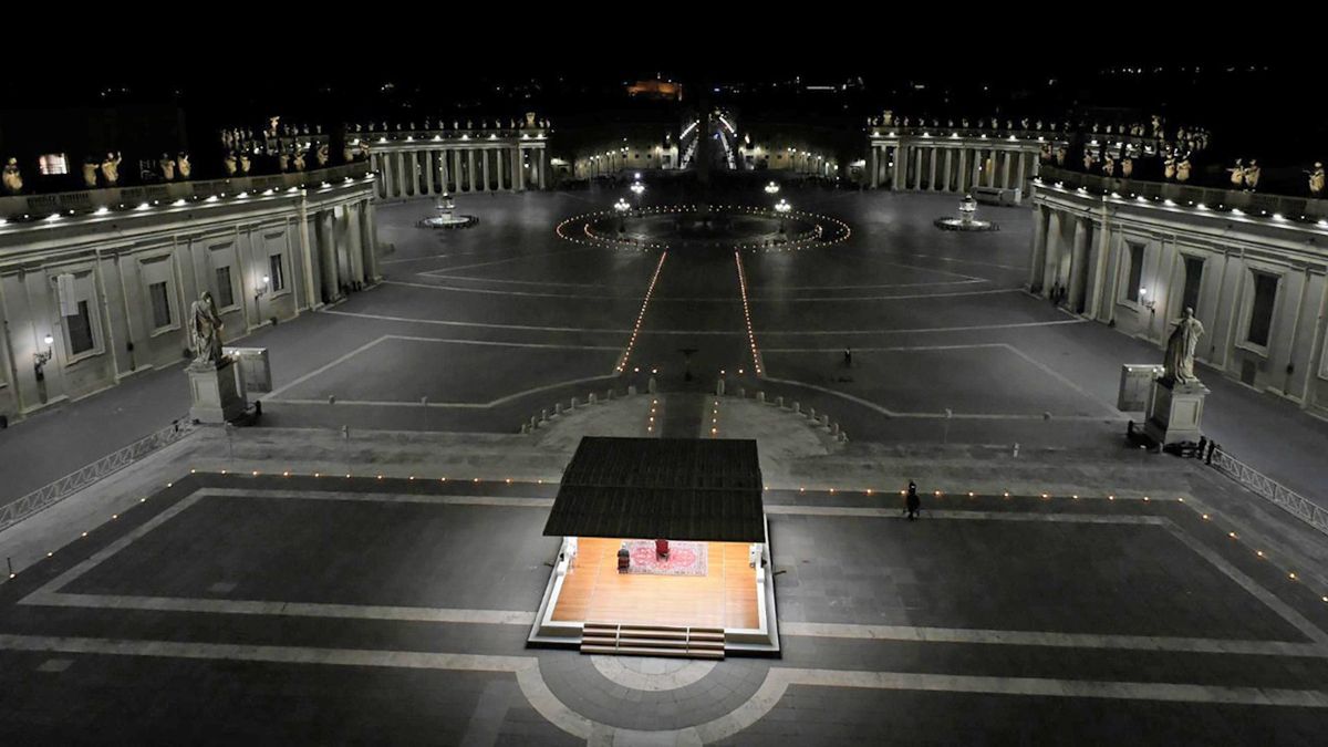 Este año, el Vía Crucis no se celebró en el Coliseo, como es tradición por ser considerado un símbolo de la persecución y del sufrimiento de los primeros cristianos, sino que tuvo lugar en una plaza vaticana completamente vacía, en silencio, iluminada por unas velas en el suelo.