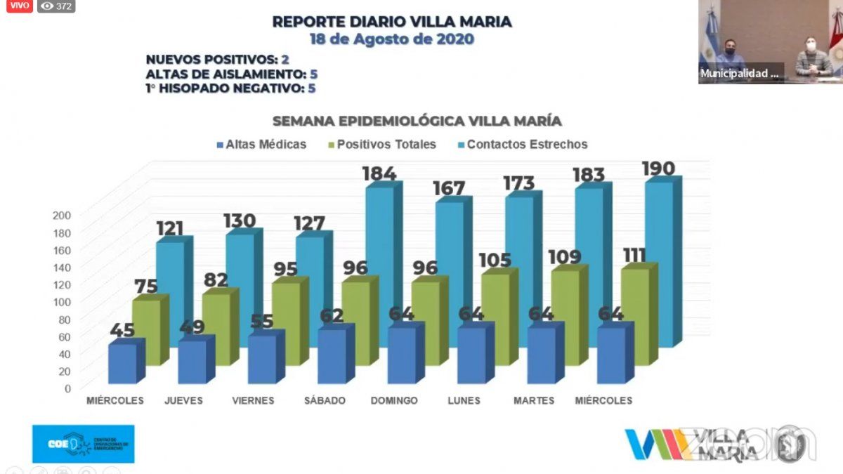 El total acumulado de casos en Villa María llegó a 111, mientras que los pacientes con alta definitiva se mantienen en 64. Cinco contactos estrechos recibieron el alta de aislamiento en las últimas 24 horas.