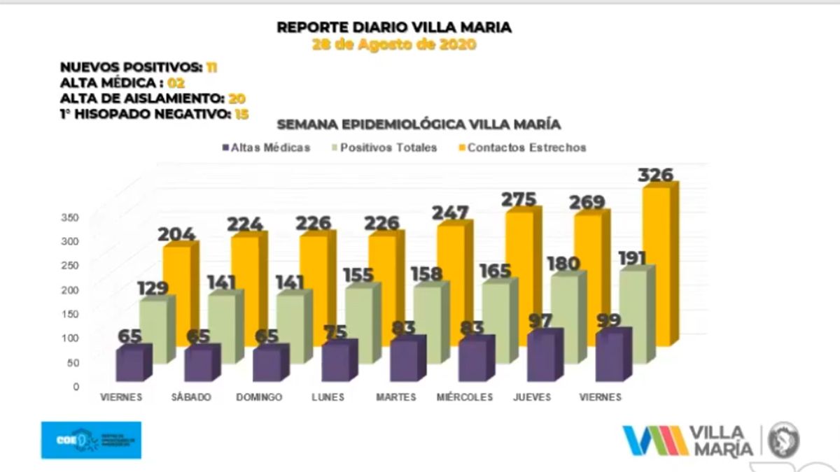El COE y el Municipio de Villa María reportaron 11 nuevos casos de covid-19 en las últimas 24 horas. Los casos activos en la ciudad son 92, de los cuales 11 se encuentran en interrelación en centros de salud. Las personas aisladas llegan a 418.