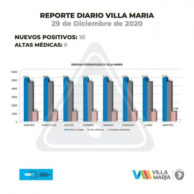 Villa María sumó este martes, 10 contagios de coronavirusy 9 altas médicas definitivas. Con estas cifras, la ciudad presenta en la actualidad 356 casos activos de Covid-19, mientras que en aislamiento se encuentran unas 1.524 personas.