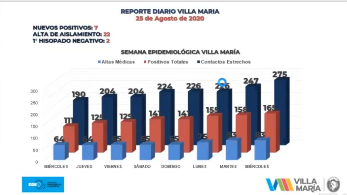 En el reporte que habitualmente realiza la Municipalidad de Villa María y el COE, se informaron 7 nuevos casos. Con estos contagios, el número de casos activos es de 82, mientras que se mantienen en aislamiento 357 personas. Dos pacientes más requirieron de internación, con lo que la cantidad llega a 8.