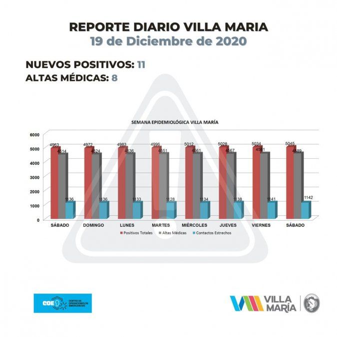 En cuanto al acumulado de casos desde que comenzó la pandemia, Villa María la cantidad es de 5.045. Los altas médicas otorgadas en ese período fueron 4.589.