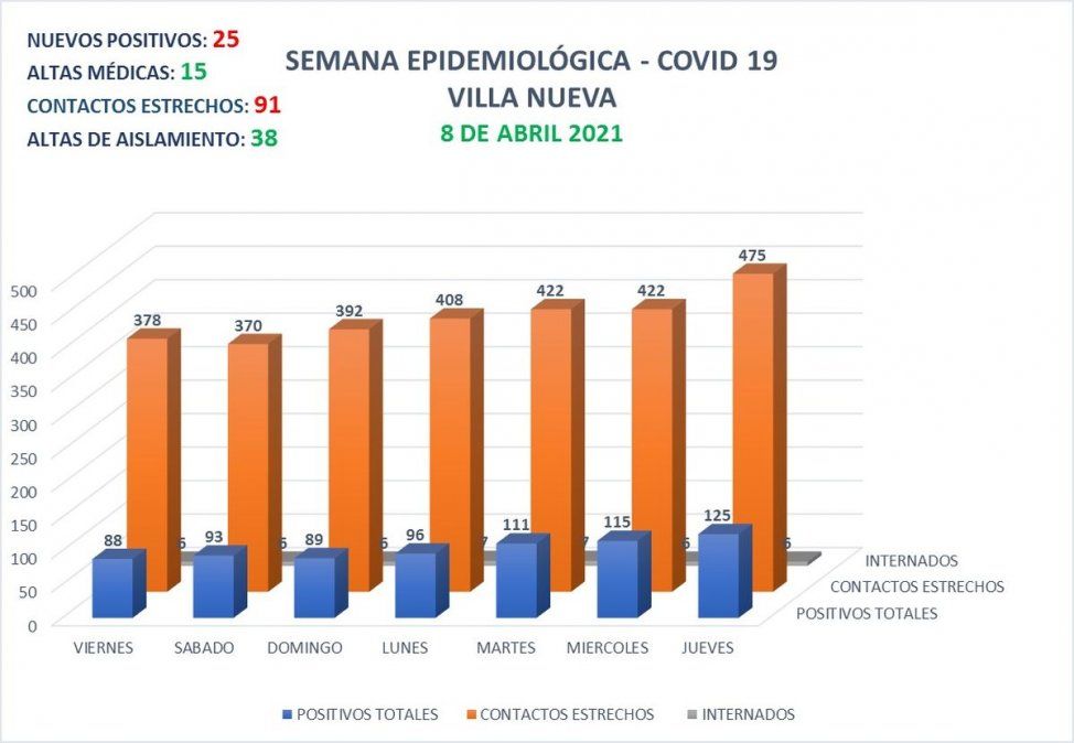 Villa Nueva reportó 25 nuevos contagios de Covid-19 en , en tanto que se otorgaron 15 altas médicas y 38 altas de aislamiento en las últimas 24 horas.