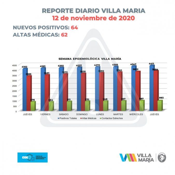 El informe epidemiológico emitido por las autoridades de Villa María, y correspondiente a este jueves, confirmó 64 nuevos casos de Covid-19. Además, indicó que se brindaron 62 altas médicas definitivas.