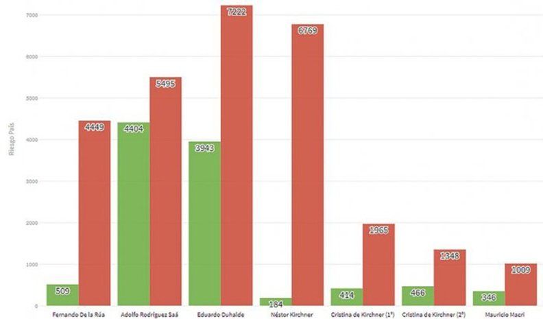 En los últimos 20 años de la Argentina el riesgo país tuvo un pico máximo de 7.222 en agosto de 2002, durante el gobierno de Eduardo Duhalde, y un mínimo de 184 en el de Néstor Kirchner.